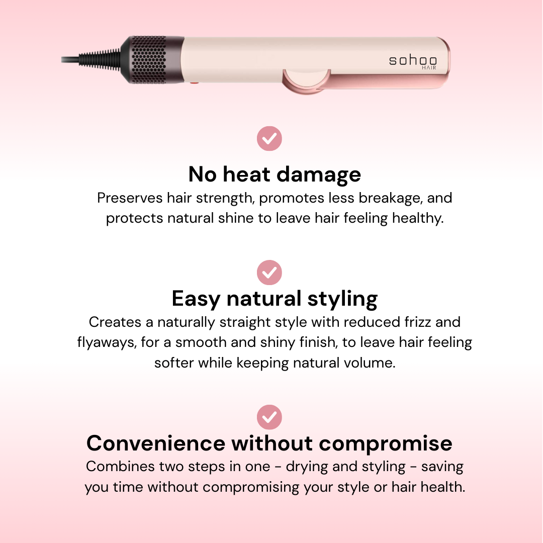 Forget harsh straightening irons. Sohoohair uses high-pressure airflow instead of hot plates, protecting your hair from heat damage.